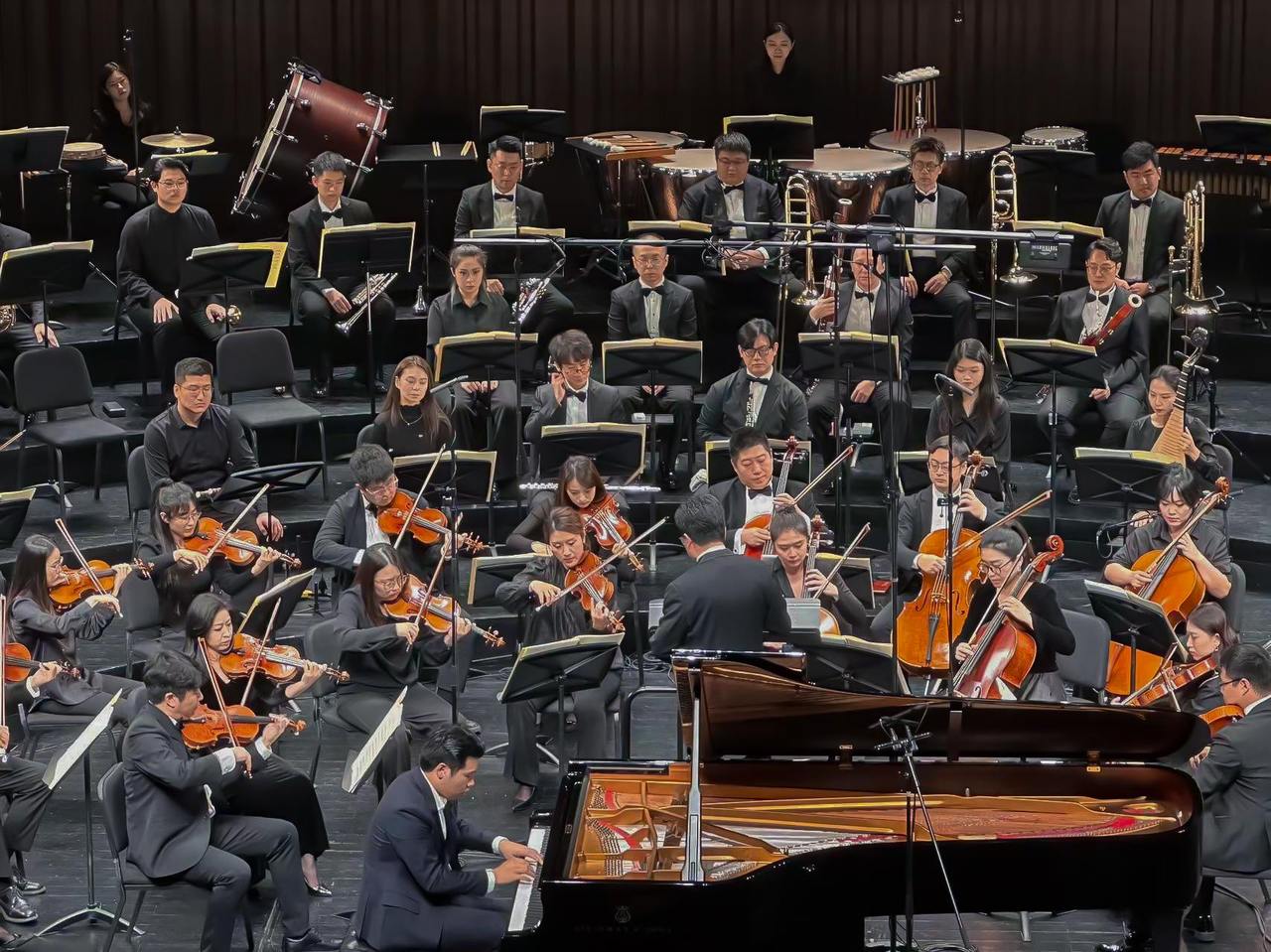 在这场高规格的音乐盛宴中,浙音师生积极参与、全情投入。音乐会上半场,钢琴协奏曲《黄河》震撼上演。这部创作于1969年的经典之作,以《黄河大合唱》为蓝本,将民族音乐的魂魄注入钢琴的黑白键之中。浙音青年钢琴演奏家吴君麟,与11所音乐学院优秀青年演奏家组成的联合乐团默契配合,在中国音乐学院教授、指挥系主任金野教授的执棒下,以极具张力的演奏将黄河的怒吼与民族的呐喊交织在一起,迸发出排山倒海的力量,奏响了中华民族不屈不挠的壮丽史诗。